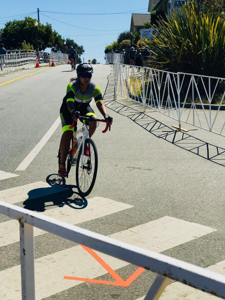 Swim: The swim cut off was 70 minutes. The 1.9 km swim was a rolling wave start which began at Cowell beach. It was a swim around the scenic wharf that was habituated by sea lions. Last year the organizers had to shorten the swim due to visibility issues. I hoped and prayed that the weather Gods were kind to us today. Clear skies and sunshine greeted us in the morning. As I stood in the 50-minute wave, I laughed and joked with people around me-a gregarious bunch who did not let the brand ironman bog them down. I was at complete ease when I entered the waters which were quite warm that morning. The challenging part of an open water swim was putting your head down and swimming. Unlike a pool, the inability to sight anything is quite daunting. So, I imagined watching some corals, fish and manta rays while I swam around the wharf. I faintly heard the sea lions barking, probably cheering for us. The volunteers on the rafts steered us in the right direction and before I knew it I had finished a strong swim in 59 minutes. I exited out of the water and ran on the sands blowing a quick kiss to my hubby and daughter, right into the transition area.